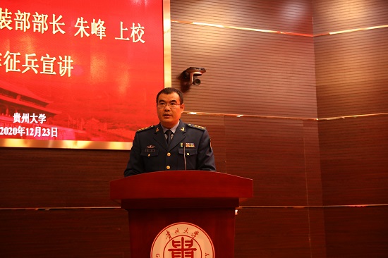 朱峰对贵州大学长期以来对国防建设及征兵工作的大力支持表示感谢,向贵州大学高标准完成2020年征兵工作任务表示热烈祝贺。他寄语我校青年学子,要有强烈的忧患意识,为民族和国家之忧而忧;要敢于接受祖国挑战,为打造世界一流军队贡献力量;要做社会主义建设者和接班人,为人民幸福、民族复兴前赴后继、英勇奋斗。