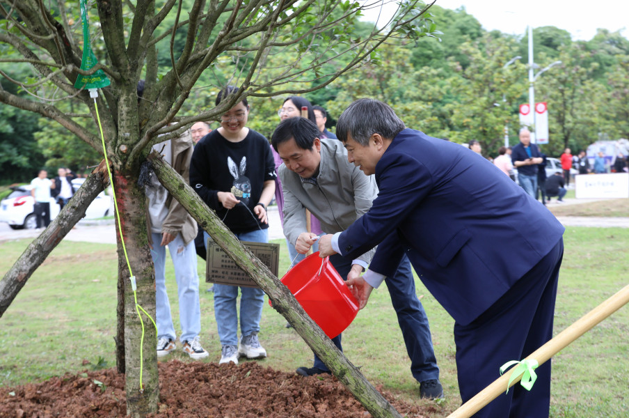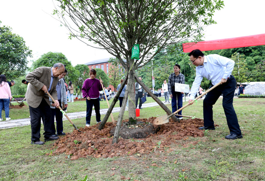各位院士和师生代表一起为“院士林”培土植树。大家拿着铁锹、水桶,培土、植树、浇水。新种下的12棵桂花树苍翠挺拔、迎风舒展,如同一座座标杆,让贵大伴随着这片“院士林”一同枝繁叶茂、欣欣向荣。