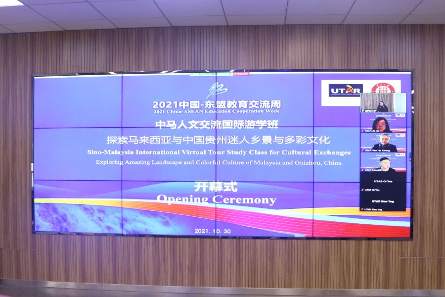 10月30日至31日,由贵州大学、马来西亚拉曼大学、中国-东盟教育交流周组委会秘书处主办,贵州大学东盟研究院、贵州大学国际交流与合作处、马来西亚拉曼大学软技能部承办的2021中国-东盟教育交流周全年期项目“中马人文交流国际游学班:探索马来西亚与中国贵州迷人乡景与多彩文化”成功举办。马来西亚拉曼大学副校长姚河光、贵州大学副校长吴攀、中国-东盟教育交流周组委会秘书处办公室副主任陈文益出席开幕式并致辞。国际交流与合作处洪云处长主持开幕式。