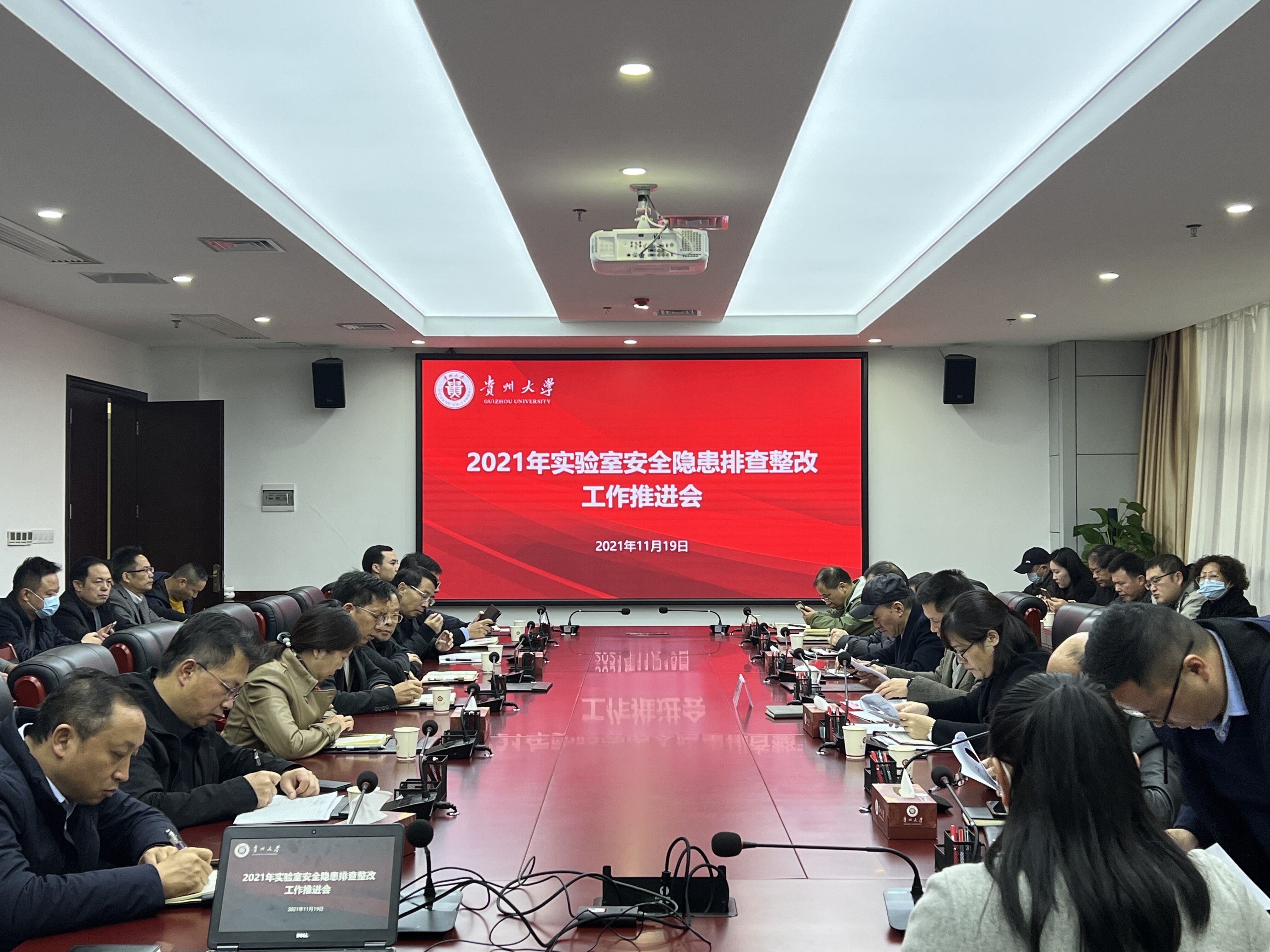 11月19日,贵州大学2021年实验室安全隐患排查整改工作推进会在西校区贤正楼1号楼102会议室召开。副校长陈祥盛出席会议并讲话,实验室与设备管理处、校直科研机构、工程训练中心、教学实验农场以及相关学院分管实验室工作负责人参加会议。会议由实验室与设备管理处副处长(主持工作)姚丽华主持。