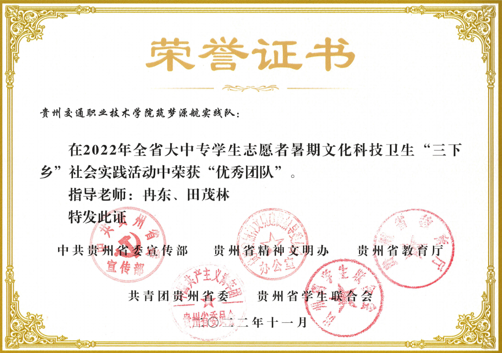 近日,中共贵州省委宣传部、贵州省精神文明办、贵州省教育厅、共青团贵州省委、贵州省学生联合会共同主办的2022年贵州省大中专学生志愿暑期文化科技卫生”三下乡“社会实践活动对获奖单位、品牌项目、团队、个人进行表彰。