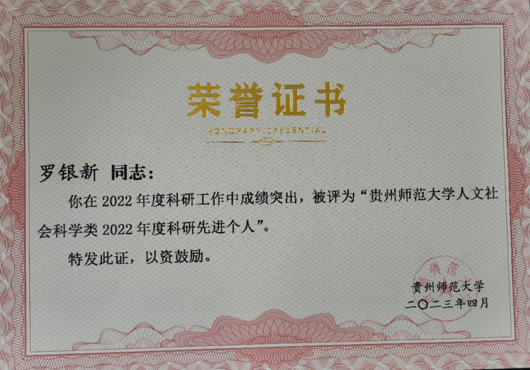 “贵州师范大学人文社会科学类2022年度科研先进个人”荣誉称号。