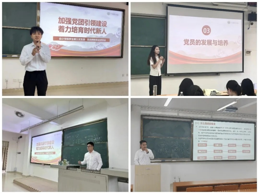 会计学院学生第三党支部坚持以习近平新时代中国特色社会主义思想为指导,全面贯彻党的二十大和二十届三中全会精神,落实立德树人根本任务,强化党性教育和理想信念教育,充分发挥党组织战斗堡垒作用和党员的先锋模范作用,扎实推进“党建育人+班团建设”模块专项工作,着力培育德智体美劳全面发展的时代新人,会计学院学生第三党支部于2024年10月21日至10月25日,在会计学院ACCA、CIMA、会计产业班、审计学、财务管理专业各班团开展以“加强党团引领建设,着力培育时代新人”为主题的宣讲会。