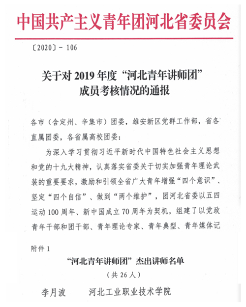 近日,共青团河北省委通报了“河北青年讲师团”考核情况,我院马克思主义学院教师李月波获得“河北青年讲师团杰出讲师”称号,在全省100名讲师团成员中脱颖而出,是26名获此荣誉称号的讲师之一。