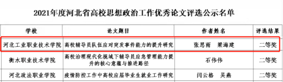 近日,由河北省学校德育工作中心、 工作队伍培训研修中心组织的2021年度河北省 工作优秀论文评选结果公示,我校互联网学院张思雨老师、梁海建老师撰写的论文《高校辅导员队伍应对突发事件能力的提升研究》和工商管理系何晓卉老师、赵娜老师撰写的论文《新时代视域下高校辅导员队伍素质能力提升策略研究》均获二等奖。