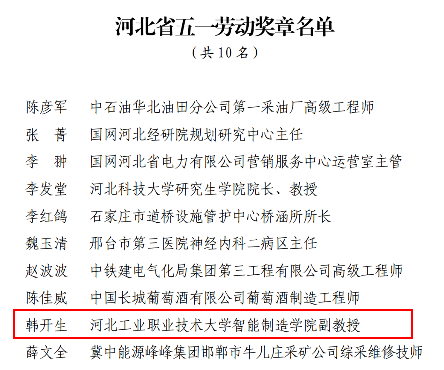 近日,河北省总工会、河北省科学技术厅联合下发了《关于命名第八批河北省劳模和工匠人才创新工作室的决定》,我校韩开生创新工作室被命名为第八批河北省级劳模和工匠人才创新工作室,排名第九(共100家)。工作室带头人韩开生副教授由省总工会授予“河北省五一劳动奖章”称号,韩开生创新工作室由省总工会授予“河北省工人先锋号”称号。
