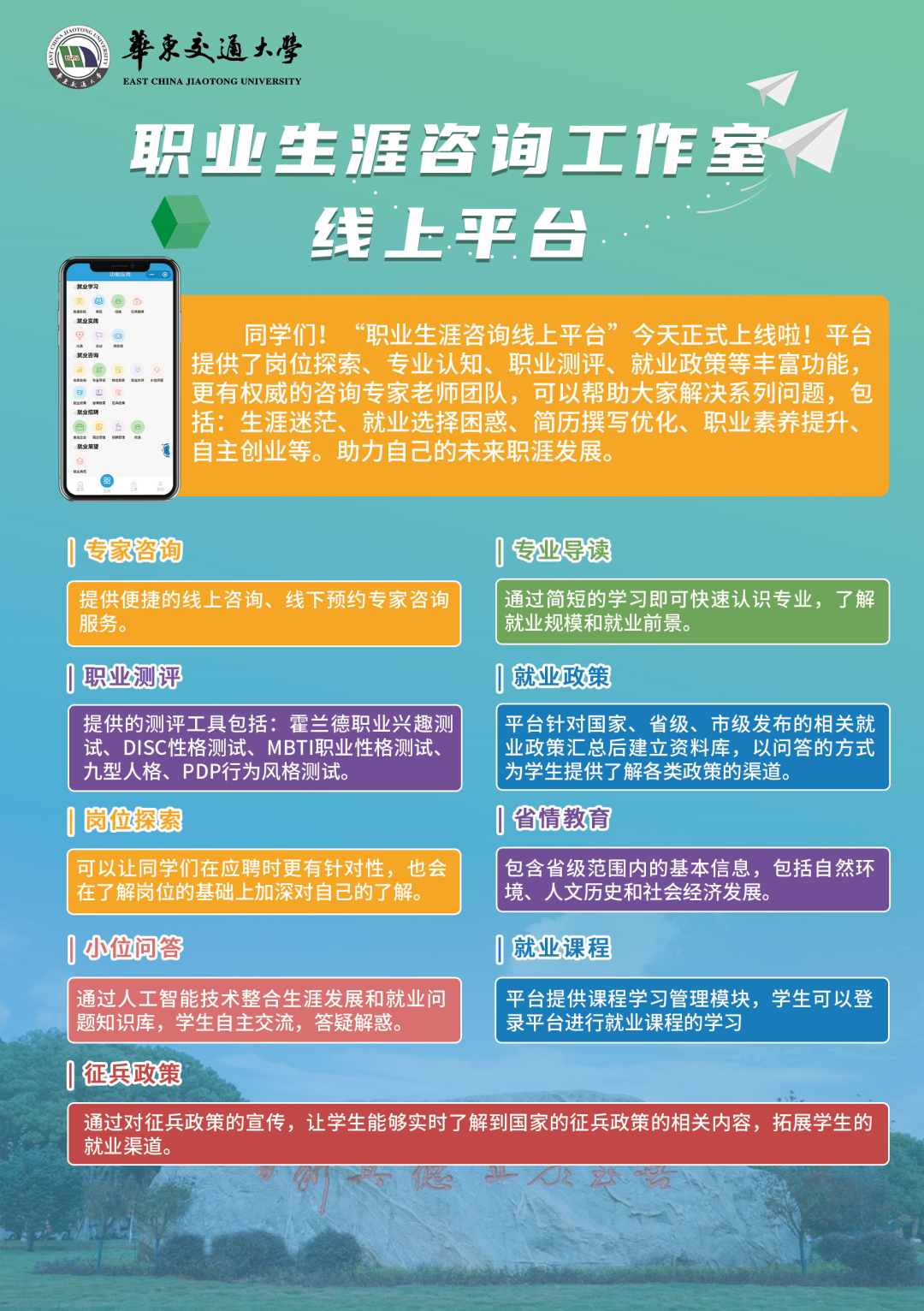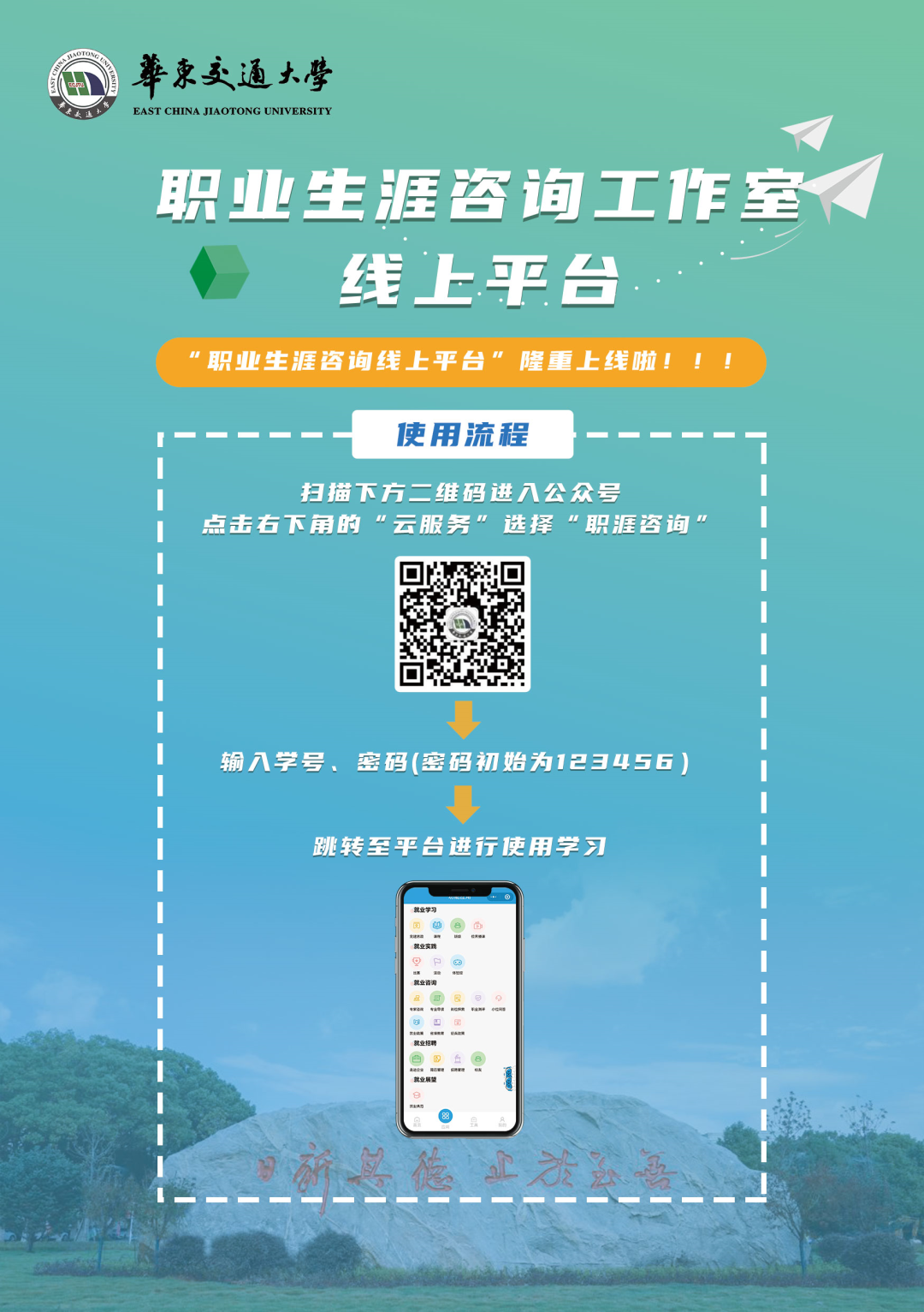 为满足广大同学成长发展过程中的个性化指导需求,提高职业规划能力和就业竞争力,现面向全体在校生开放“职业生涯咨询线上平台”