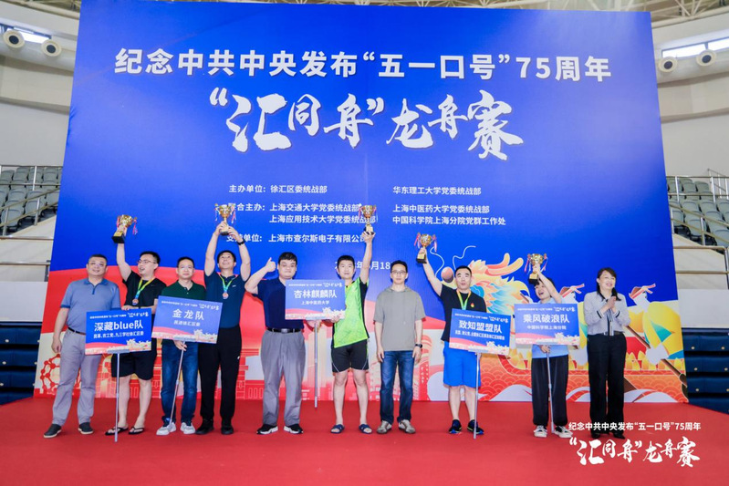 经过预赛、决赛的激烈角逐,民建徐汇区委“聚力稳舵队”获得冠军,上海交通大学“交龙队”获得亚军,徐汇区侨联“侨·怎么划都队”获得季军,民进徐汇区委“金龙队”,中国科学院上海分院“乘风破浪队”,上海中医药大学“杏林麒麟队”,民盟、致公党、台盟徐汇区委及徐汇区知联会联合组成的“致知盟盟队”,民革、农工党、九三学社徐汇区委联合组成的“深藏blue队”获得优胜奖,九三学社华东理工大学委员会“华龙队”,各高校统战干部联合组成的“团结联合队”,致公党华东理工大学委员会、侨(台)联联合组成的“致侨同舟队”,华东理工大学民族联、知联会、欧美同学会联合组成的“龙腾海湖队”,民盟华东理工大学委员会组成的“立盟为公队”,上海应用技术大学“同舟队”,民革、民建、民进、农工党华东理工大学(总)支部委员会联合组成的“汇贤同舟队”获得风采奖。校内外领导、嘉宾分别为获奖队伍颁奖。