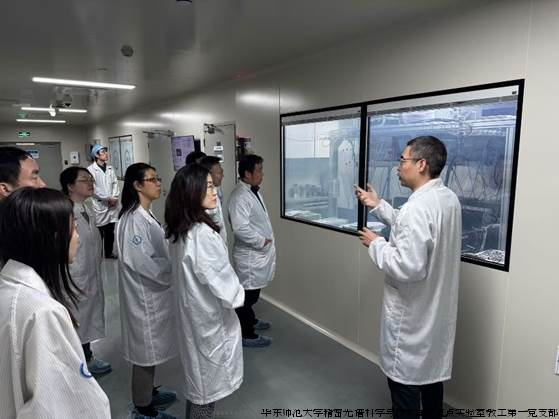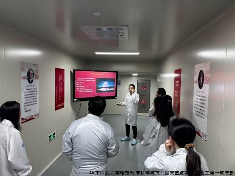 经济系教工党支部一行首先参观了精密光谱党员教育空间,潘海峰详细讲解了空间的设计理念,展品和照片背后的实验室历史沿革。随后一行人前往地下超净实验室,了解光学领域的研究前沿。活动还特别安排了参观设在实验室内的“两弹一星元勋生平事迹展览”,通过微党课的形式,深入解读“两弹一星”的历史背景和精神内涵,强调了科学家精神在推动国家前进中的关键作用。