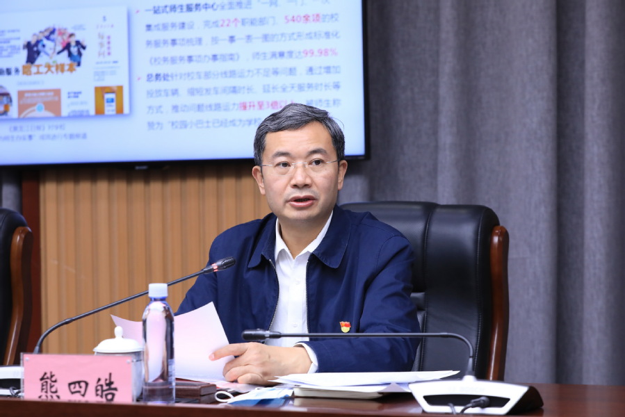 熊四皓从典型做法和工作成效、工作亮点和新鲜经验等方面全面总结了学校党史学习教育开展情况,并对下一步工作提出了要求。熊四皓指出,党史学习教育开展以来,在中管高校党史学习教育第五指导组的精心指导下,学校党委坚持以习近平总书记贺信精神为引领,深入学习贯彻习近平总书记重要讲话和重要指示精神,紧跟中央重大部署,围绕“学党史、悟思想、办实事、开新局”目标要求,自觉在“六个进一步”上下硬功夫、实功夫,推动党史学习教育常态化机制化建设。通过构建“学习”机制,引领党员、干部从党的百年奋斗历史中汲取智慧和力量,感悟思想伟力,忠诚拥护“两个确立”,坚决做到“两个维护”;构建“教育”机制,以伟大建党精神引领、以红色血脉传承凝聚广大师生,设立校园红色见学点的创新举措被中央媒体广泛报道;构建“我为师生办实事”工作机制,一批师生“急难愁盼”问题得到解决,师生满意率始终保持高位;构建“组织生活和中心工作深度融合”机制,“两优一先”在服务工作大局中的典型示范带动效应充分彰显;构建“成果转化”机制,扎根边疆、走在前列的高质量发展动能空前强劲;构建“组织领导”机制,“高效”“务实”成为师生好评关键词。