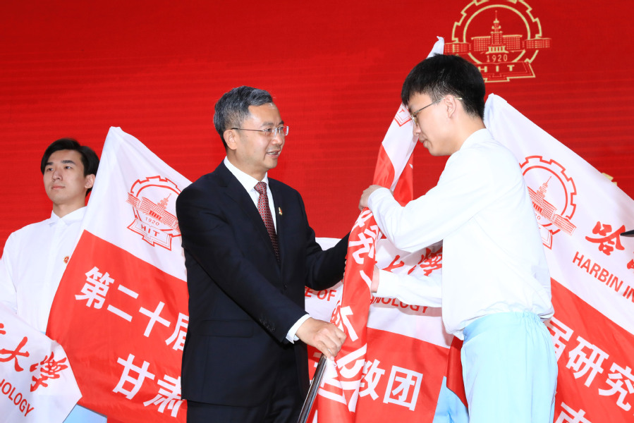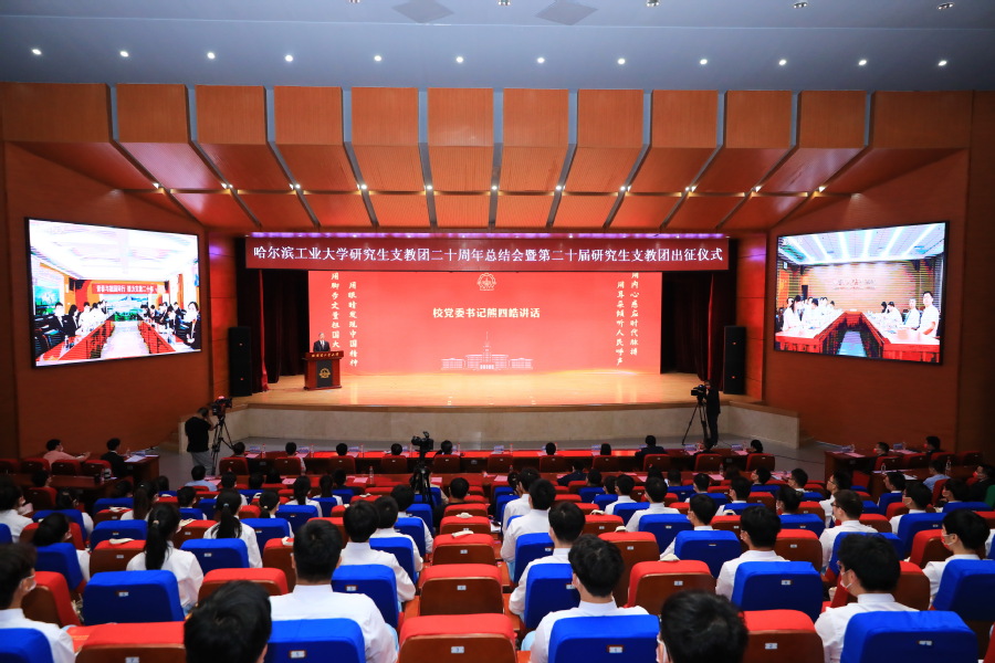 哈工大全媒体(商艳凯/文 辛然/图)6月14日上午,学校以线上线下相结合的方式举行“青春与祖国同行 接力支教二十年”哈工大研究生支教团二十周年总结会暨第二十届研究生支教团出征仪式。校党委书记熊四皓为我校第二十届研究生支教团各服务队授旗并讲话。