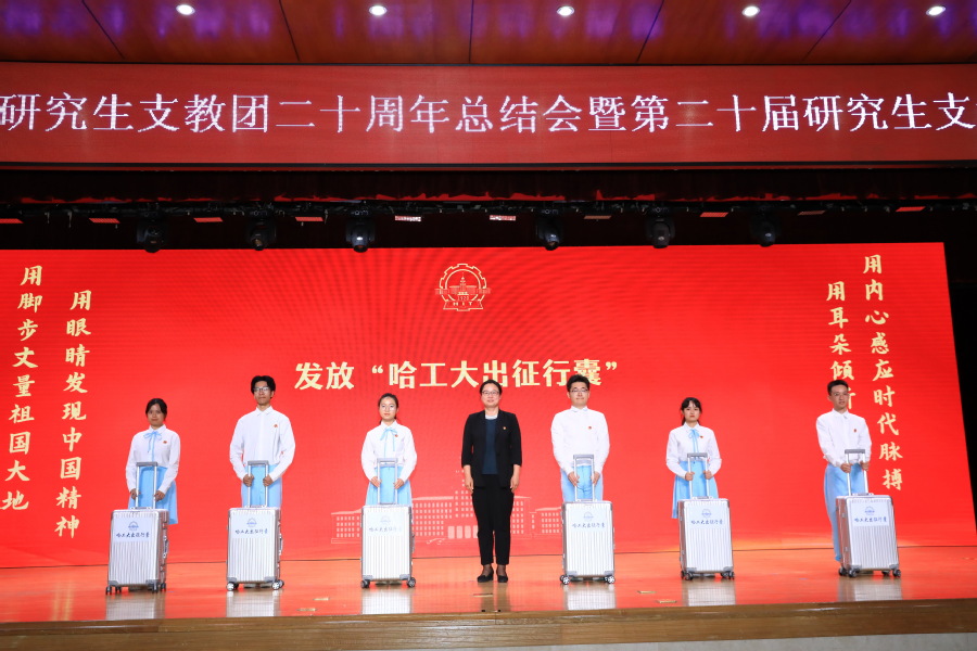 哈工大教育发展基金会为即将出征的支教队员准备了包括行李箱、背包、支教日志、纪念徽章等物品的“哈工大出征行囊”。基金会副理事长、副校长孙雪为支教队员代表发放“出征行囊”。