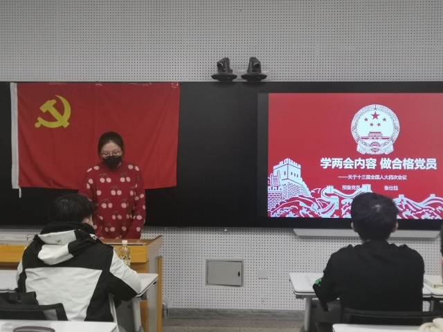 在党课分享部分,四名同学结合时事带来了精彩的讲解。朱玉鹏同学讲到每一位党员都是一座界碑,为守护我们亲爱的祖国贡献着力量。高昭,单博文,张仕钰四名同学针结合两会热点,阐释了自己对于两会精神的理解。高昭同学概述了两会内容要点,解读了政府报告,着重讲述了涉及民生部分内容。他讲道:“我们的党是人民的党,政府报告让我们看到了党对民生问题的密切关注。只有民生得到了保障,经济得到了稳定,祖国才能进一步发展。”