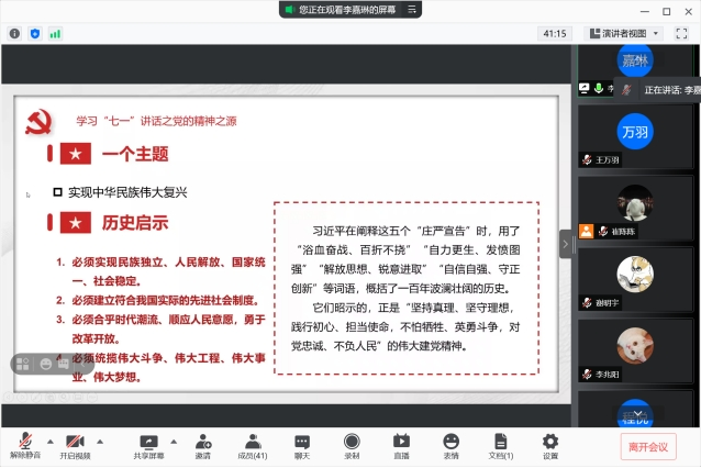 本次理论学习由李嘉琳同志主讲,她从五个庄严宣告、伟大建党精神——凝结着百年奋斗的伟大品格、伟大建党精神——砥砺着百年奋斗的初心使命、伟大建党精神——昭示着百年奋斗未有穷期四个方面讲解了百年党史。她指出,一百年来,一代又一代中国共产党人顽强拼搏、不懈奋斗,涌现了一大批视死如归的革命烈士、一大批顽强奋斗的英雄人物、一大批忘我奉献的先进模范。一百年来,一代又一代中国共产党人顽强拼搏、不懈奋斗,形成了一系列伟大精神:井冈山精神、长征精神、遵义会议精神、延安精神、西柏坡精神、红岩精神、抗美援朝精神、“两弹一星”精神、特区精神、抗洪精神、抗震救灾精神、抗疫精神……在新征程中全面深化改革开放需要“为有牺牲多壮志,敢教日月换新天”的大无畏气概、推进科技自立自强需要勇于变革、勇于创新的奋斗精神、协同推进人民富裕、国家强盛、中国美丽需要始终同人民想在一起、干在一起的为民情怀。