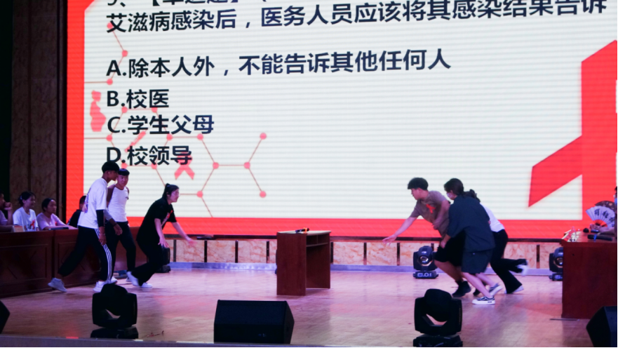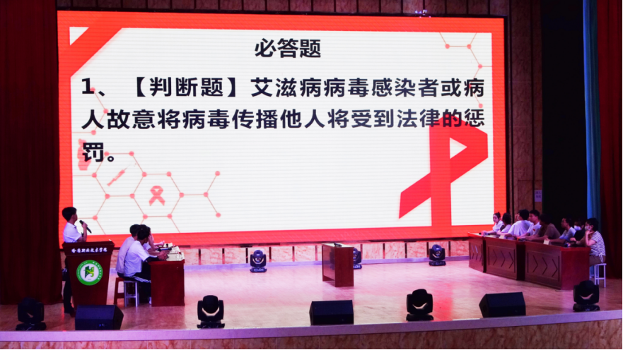 活动设置必答题、抢答题、风险挑战题三种题型,由各系推选3名学生组队参赛,共6个参赛队。参赛选手激烈角逐,表现优异,引起现场评委老师与观众的强烈共鸣。最终共角逐出一等奖1组、二等奖1组、三等奖1组、优秀奖3组。比赛期间还设置观众互动问答小环节,在场学生踊跃举手回答防艾知识问答,并发放小礼品,让同学们共同参与到此次竞赛中。