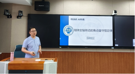 两位青年教师实战演练,为大家完整呈现了自己参赛的内容。陈素华以“带电粒子在磁场中的运动——洛伦兹力”为题,介绍了整个教学设计的情况、问题与困惑,以及自己的备赛情况。随后张光彪从说课、试讲两个环节完整呈现了备赛内容“刚体定轴转动的角动量守恒定律”。与会教师围绕两位老师的讲授内容进行了热烈交流与讨论。苏作鹏、李若平、彭成晓等多位老师从教学模式、教学方法、案例设计、课程思政以及比赛的注意事项等方面提出了一些修改意见。教研室的其他老师积极踊跃发言,从教学内容合理安排到教学设计内在逻辑,再到教态、语言等方面提供了细致入微的指导和帮助。