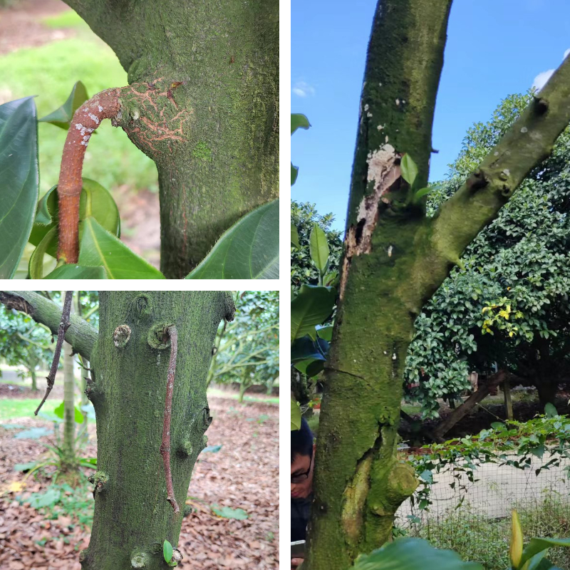 随后,老师们来到琼海市塔洋镇榴莲蜜种植示范园。榴莲蜜是典型的热带果树之一,特别适宜在海南这样的高温高湿地区种植。老师们在调查中发现,园内部分榴莲蜜长势较差,部分植株在果实采收后没有及时进行修剪和保护,致使果梗处遭受一些病菌侵染,树势变弱甚至整株枯死。老师们根据调查结果,从害虫防治以及果实采后果树修剪及保护等方面,给榴莲蜜种植园管理人员提出了综合防治的建议。