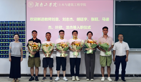 刘意、刘志杰、胡廷宇、张旺、马谕杰、叶欣和龙杰等七名青年教师在热烈的掌声中走上讲台,一一进行简洁的自我介绍,表达了对加入土木学院的喜悦之情,以及立志成为一名优秀教育工作者的信心。黄卫华代表全体教职工对七名新进教师表示热烈欢迎,为新进教师赠送了鲜花,希望新进教师不忘教育初心,勇担发展使命,为学院人才培养与学科建设贡献自己的力量。