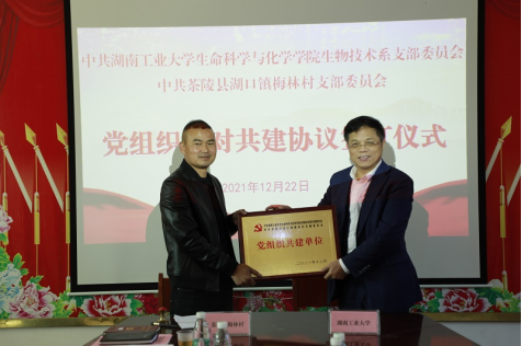 唐秋玲和汤建新分别与梅林村党支部和茶陵梅林红柚农民专业合作社签订了《党组织结对共建协议书》《关于共同建设“有机农业、循环农业、农业科学技术创新示范村”产学研合作协议》。谭益民向梅林村党支部授党组织共建单位牌匾。
