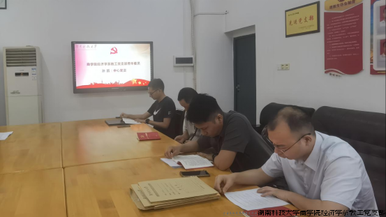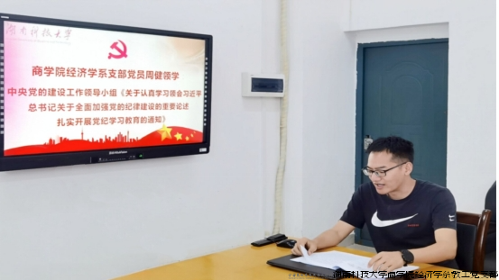 2024年6月18日下午,商学院经济学系教工党支部在三教103举行“争先创优立新功,履职尽责做表率”主题党日活动。这次活动旨在通过深入学习贯彻习近平总书记关于全面加强党的纪律建设的重要论述,激励党员们锐意进取、开拓创新,引导党员争当先锋模范,以实际行动践行党的宗旨。王鹤书记主持会议,全体支部党员参加会议。
