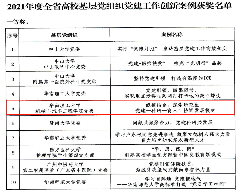 610日,广东省委教育工委公布广东省高校基层党建工作创新案例评选结果。机械与汽车工程学院党委工作案例《纵横结合,探索研究生“党建—科研—育人”协同发展模式》荣获全省一等奖。这也是继学院党委书记晋刚工作案例、本科生第三党支部书记魏争工作案例分别于2019年、2018年获评广东省基层党组织书记工作案例一等奖后,第三次获此省级殊荣。