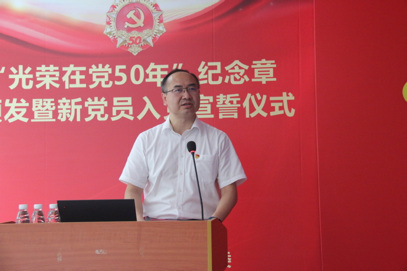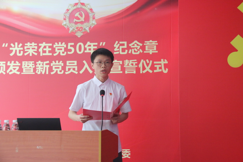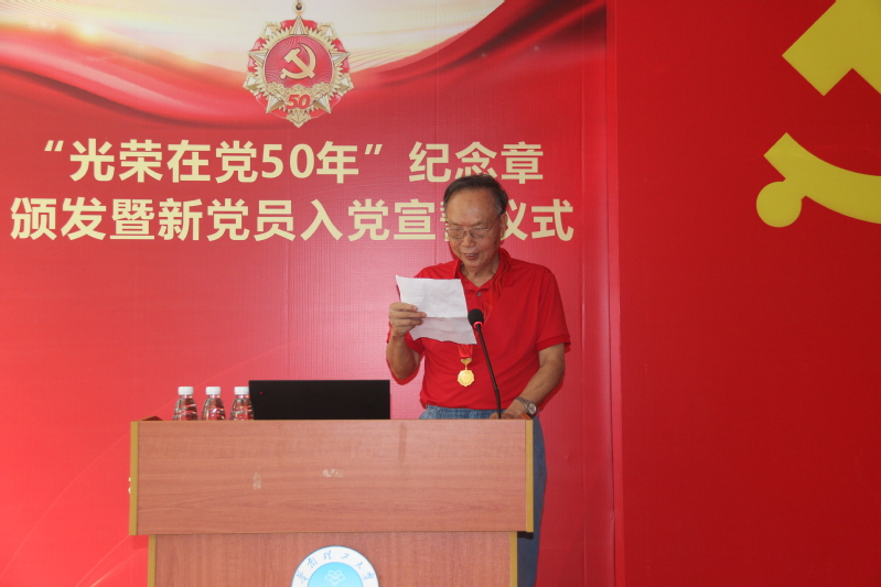 7月1日下午,在中国共产党101岁华诞到来之际,机械与汽车工程学院于29号楼三楼会议室举行“光荣在党50年”纪念章颁发暨新党员入党宣誓仪式。学院党委书记晋刚、副书记李嘉出席活动,办公室党支部书记吴春年、党委组织员徐铭遥、研究生辅导员封雪霏,工业装备与控制退休党支部书记刘钧泉、机械制造第二退休党支部书记潘国如,在党50年老党员吴春苗、黄有发、陈世煌,以及92名新党员参加仪式。