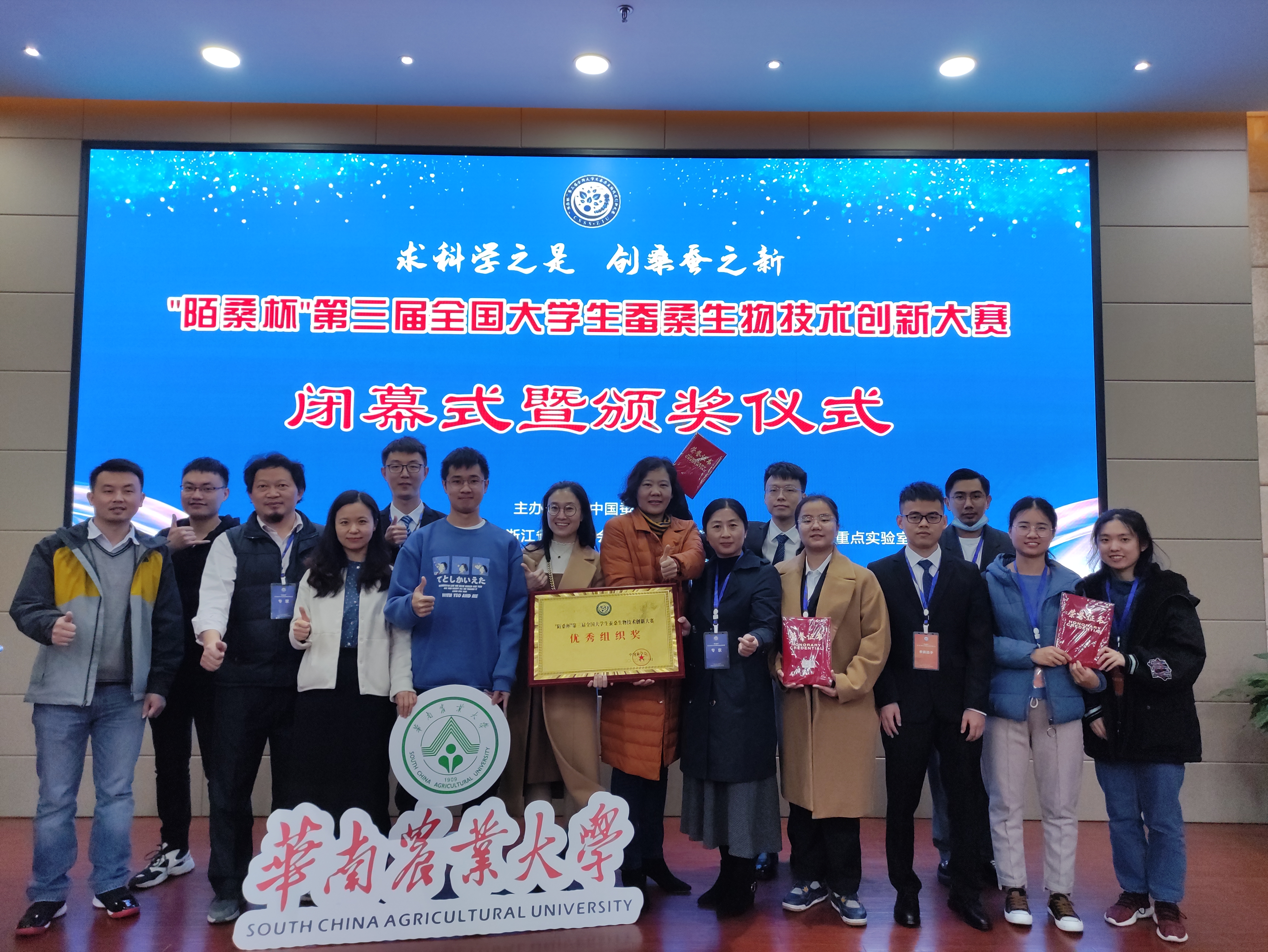 11月27-29日,由中国蚕学会主办,浙江大学动物科学学院、浙江省蚕桑学会、浙江省蚕蜂资源综合利用与创新研究重点实验室承办的的“陌桑杯”第三届全国大学生蚕桑生物技术创新大赛在浙江大学紫金港校区举行。共有来自西南大学、浙江大学、华南农业大学、江苏科技大学、中国科学院、苏州大学、江苏大学等12高校和科研院所的115项作品参赛,经过初赛和决赛的激烈角逐,我校由蚕学专业学生组合参赛的10项作品,在三个组别中共荣获特等奖3项,一等奖3项,二等奖4项。同时,我校再次荣获优秀组织奖。