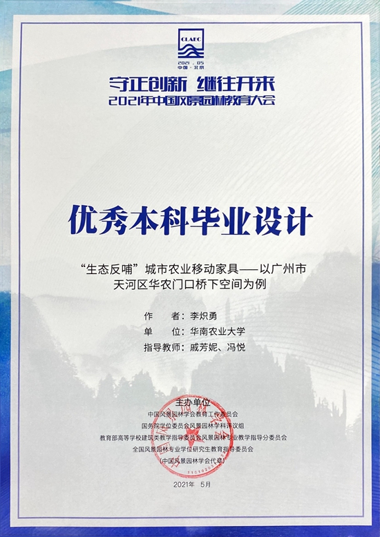 日前,由中国风景园林学会教育工作委员会、国务院学位委员会风景园林学科评议组、教育部高等学校建筑类教学指导委员会风景园林专业教学指导分委员会、全国风景园林专业学位研究生教育指导委员会联合主办、北京林业大学承办的2021年中国风景园林教育大会在北京成功召开。本次大会同时举办2021年中国风景园林教育大会优秀本科毕业设计评选等活动,我校艺术学院环境设计专业李炽勇同学的作品《“生态反哺”城市农业移动家具—以广州市天河区华农门口桥下空间为例》,获评“优秀本科毕业设计”; 戚芳妮、冯悦获评“本科毕业设计优秀指导教师”。广东地区高校仅有华南理工大学和我校荣获该奖项。