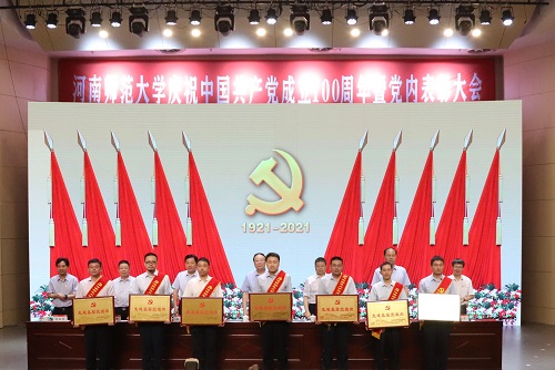梅宪宾宣读荣获河南省高校先进基层党组织、先进个人名单以及《中共河南师范大学委员会关于表彰2020-2021学年度先进基层党组织和先进个人的决定》。全校共有6个基层党组织被评为河南省高校先进基层党组织;4名同志被评为河南省高校优秀共产党员;4名同志被评为河南省高校优秀党务工作者;7个先进基层党委(党总支)、38个先进教工党支部、15个先进学生党支部、140名教职工优秀共产党员、46名学生优秀共产党员和60名优秀党务工作者荣获河南师范大学2020-2021学年度先进基层党组织和先进个人荣誉称号并上台领奖。全国党建工作标杆院系、我院党委书记来俊军,受表彰教师党员代表、商学院教师周芳,受表彰学生党员代表、计算机与信息工程学院学生苏畅分别发言,深切表达对党的百年华诞的衷心祝福。