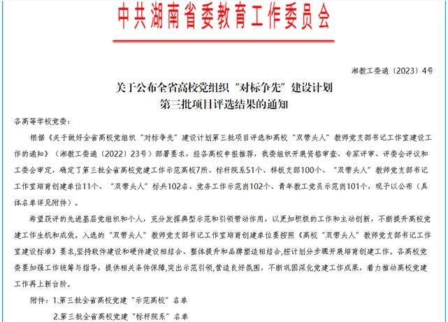 中共湖南省委教育工委公布全省高校党组织“对标争先”建设计划第三批项目评选结果。管理系党总支成功入选全省高校党建标杆院系