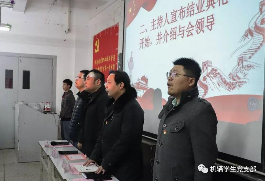 2019年12月23日中午12点30分,机辆学院学生党支部在实训楼312举行了第十三期入党积极分子培训班结业典礼。机辆学院党总支副书记罗伟、机辆学院专职组织委员徐磊、机辆学院第一学生党支部书记黄明锐、机辆学院第二学生党支部书记旷灿华、党员老师陈慧婷及61名入党积极分子出席了本次结业典礼。结业典礼由机辆学院第一学生党支部书记黄明锐主持。