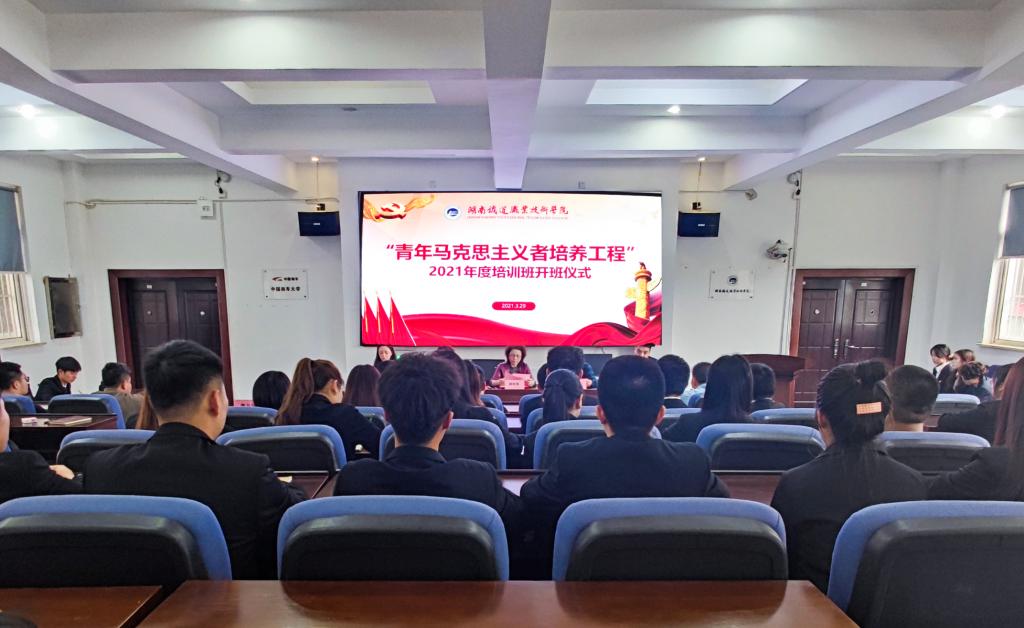 3月29日下午,学校“青年马克思主义者培养工程”2021年度培训班在中车大学425正式开班。学校党委副书记杨利军、副校长刘志成、马克思主义学院院长田文艳、团委书记高峰、团委副书记刘江妮出席会议,“湖铁青年讲师团”成员、各分团委书记及青马学员共计50余人参加,开班仪式由高峰主持。