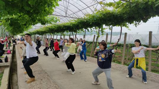 下午,组织开展了有益教职工身心健康的团建拓展活动,在长长的青绿葡萄藤下,以《八段锦》拉开了序幕,在体育课部老师的带领下,全体教职工共同参与,老师们动作柔和缓慢,圆活连贯、松紧结合,动静相兼、神与形合,气重其中,完美地展现了运动之美、健康之魄。紧接着一段最火抖音刘畊宏的毽子舞让大家彻底放飞自我,跟着音乐翩翩起舞、动感十足、活力四射、沉浸在欢快的笑声中,形成了一道靓丽的风景线。