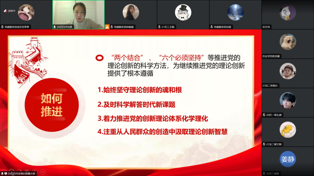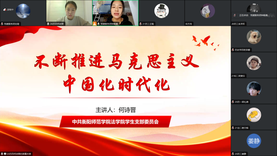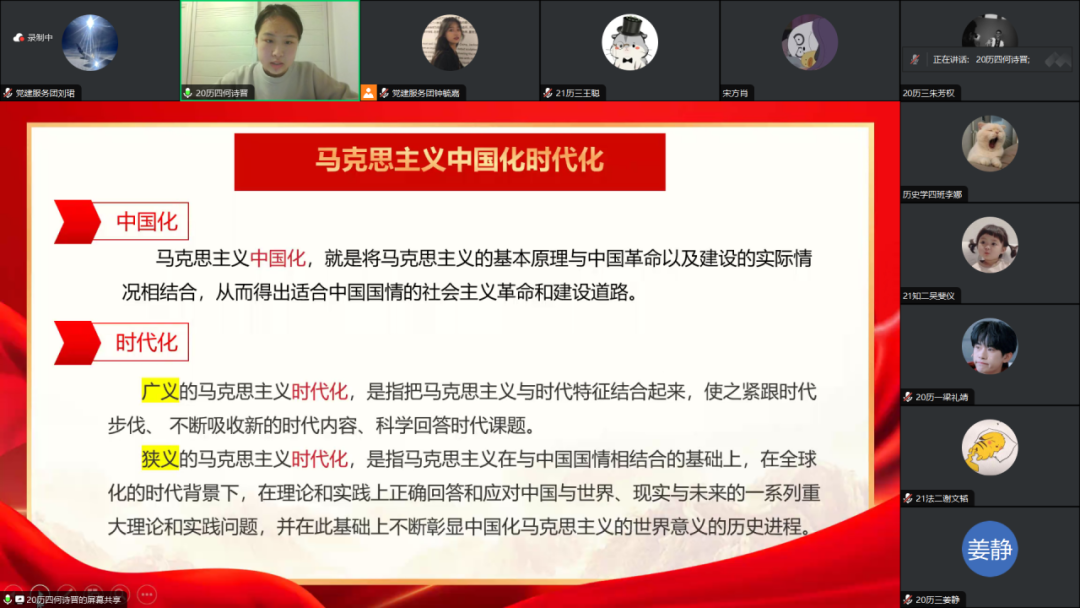 为加深我院学生党员对马克思主义中国化时代化知识的理解,强化党的二十大理论学习,在以学铸魂中筑牢信仰之本、补足精神之钙、把稳思想之舵,进一步提升自身服务能力。12月14日19:30,我院学生党支部开展了“不断推进马克思主义中国化时代化”线上主题党课。此次党课全部学生党员参与,由我院学生党员何诗晋讲授党课,2022级历史学3班钟毓嘉担任主持人。