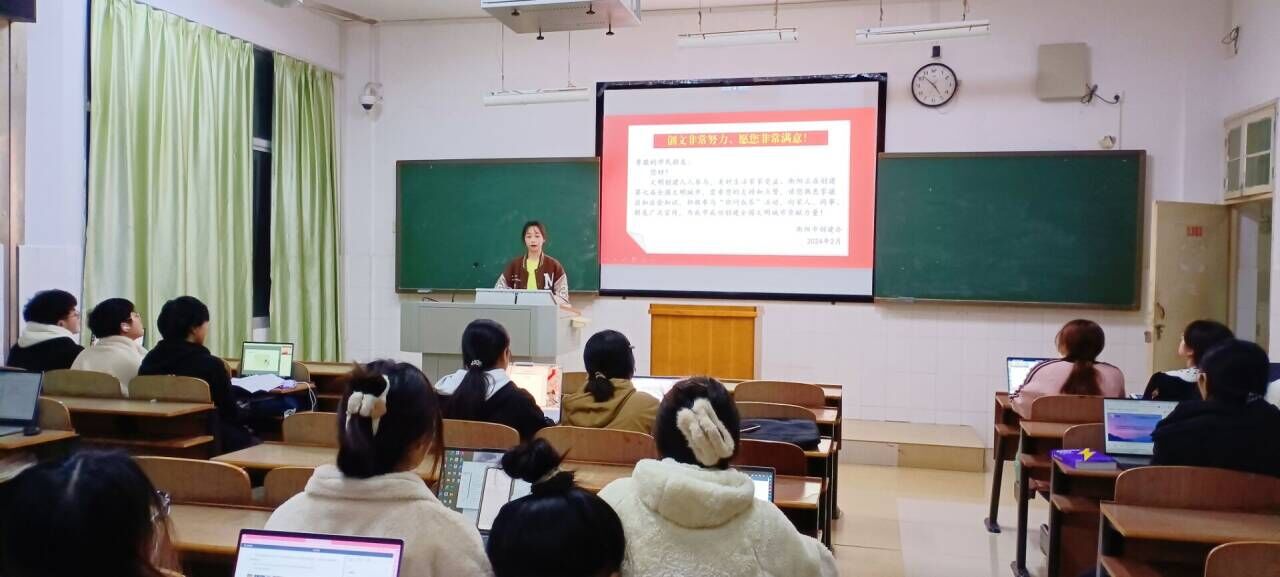 为提升我院学子对创建全国文明城市的知晓率、支持率和参与率,进一步营造和谐、美丽的校园氛围,3月19日20:00,我院学生党支部积极开展文明创建走访宣传活动。我院学生党员潘婷、钟锦深入班级开展创建全国文明城市应知应会宣讲活动,向同学们普及城市文明创建相关知识,详细介绍了我市在近年来全国文明城市创建方面所取得的成效,呼吁同学们为衡阳市成功创建全国文明城市贡献青春力量。宣讲结束后,同学们积极填写文明城市创建调查问卷,进一步感受创文的重要性和必要性。