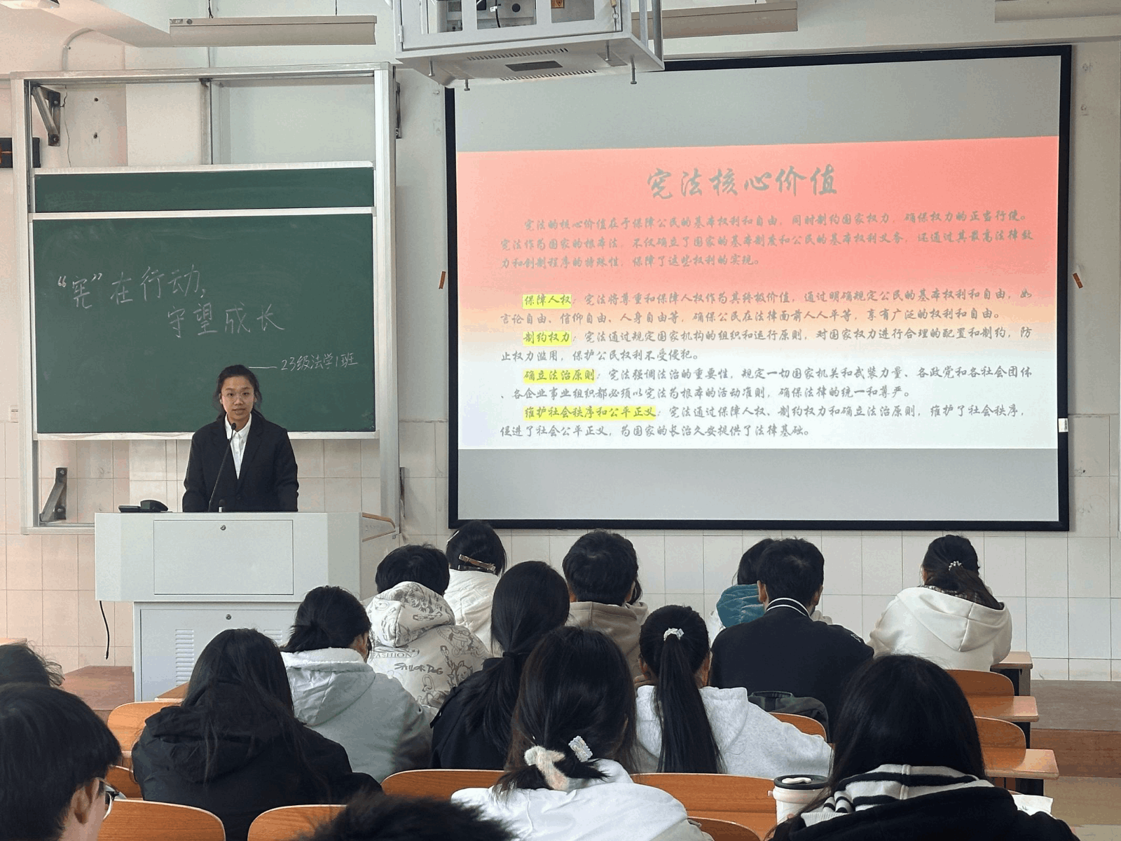 我院学生党支部宪法宣讲团成员通过精心制作的PPT,以图、文、声结合的形式展示了宪法的发展历程。他们穿梭于各个班级中,为同学们说明了法律是治国之本的原因,也详细阐释了宪法的基本原则、公民的基本权利与义务等相关内容,同时台下的同学们也积极参与讨论,各抒己见,沉浸在浓厚的宪法学习氛围当中。宣讲过后,同学们深刻意识到宪法的力量不仅体现在维护国家秩序、保障人民权益的宏观层面,更渗透于校园生活的点滴之中,时刻规范着、引导着、保护着每一个人。