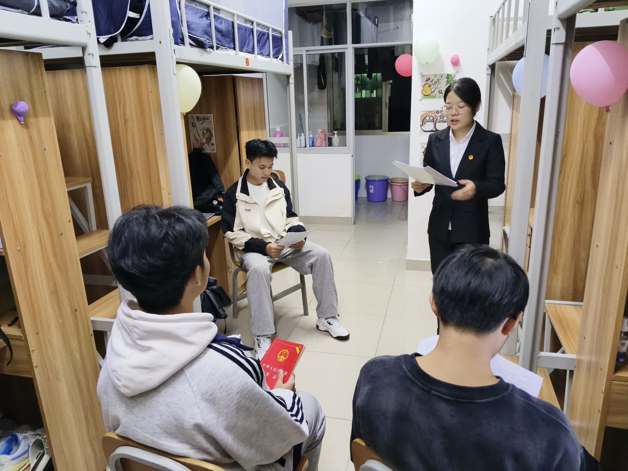 我院学生党支部宪法宣传团成员始终贯彻习近平总书记关于宪法法治教育的重要指示精神,化身法治“播种人”走进各个寝室。他们利用发放宣传资料、展示实际案例等多种方式讲解宪法精神、社会主义法治文化等内容。本次的“宪法下寝室”活动提升了宪法在学生心中的知晓度和普及度,促使我院学生时刻牢记宪法要求,将守法行动落实到点滴日常,共同营造和谐有序、充满法治气息的宿舍环境。