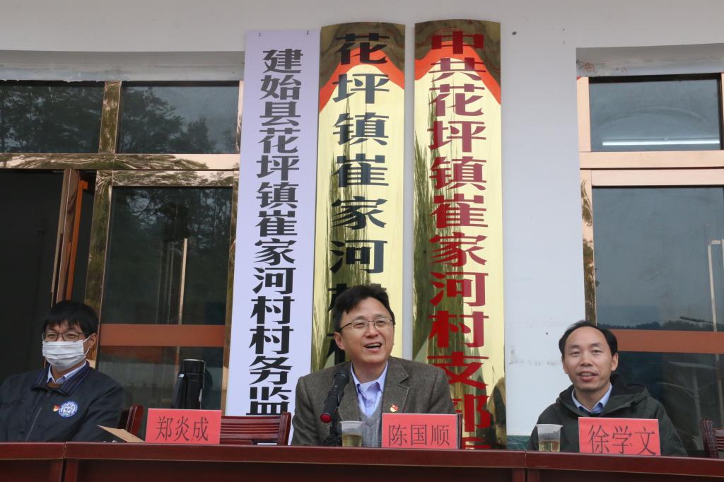 陈国顺在讲话中谈到,才干来源于实践、致富的源泉来自于群众,这次活动促进了党员干部与村民以及村民之间的深入交流,非常有意义。他从谢意、敬意、心意三个层面进行了总结。他说,看到崔家河村发展越来越好、管理越来越科学、村民精气神越来越充足,自己作为一名党员干部深知这一切离不开党和国家的关怀,离不开建始县委县政府对崔家河村发展给予的支持和帮助,在此表达深深的感谢。对以崔家河村原党支部书记崔德安和驻村第一书记周瑟锴为代表的村干部在实际工作中始终以村为家、把村民当亲人的崇高精神表达了深深敬意,并号召广大党员向他们学习。他谈到此行的心意有三:一是看望村民疫情过后生产生活恢复的怎样?看到村民生活井然有序,感到非常欣慰;二是根据当地需要送一些化肥肥料,助力生产;三是通过主题党日邀请两位专家教授作报告,为乡村发展传经送宝,为促进村民生活幸福做一点事情。他强调乡村振兴的内涵在于产业要兴旺、生态要宜居、乡风要文明、治理要有效、生活要富裕,作为致力于三农问题研究的学院,有义务和责任为湖北乡村振兴做出自己的贡献。未来,学院将继续与崔家河村通过“1+1”党建扶贫活动,在组织建设、党员教育、扶贫帮困、技术咨询等方面连心共建,抓党建,聚民心,促进崔家河村更好地发展。