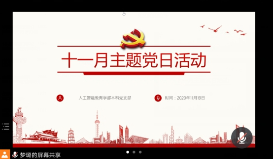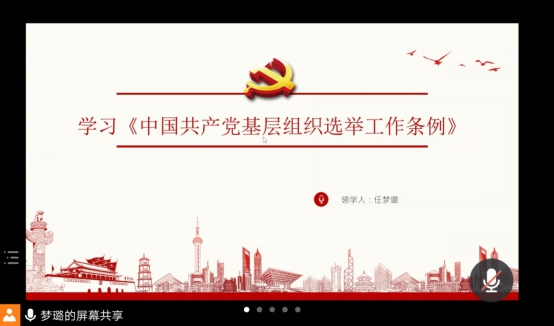 2020年11月19日晚上7点,我学部本科生党支部开展了11月线上主题党日活动。根据学校组织部要求,本次主题党日活动共有2个环节:开展基层党组织和党员诊断行动、学习《中国共产党基层组织选举工作条例》。活动由本科生党支部书记任梦璐主持,本科生党支部全体党员参加。