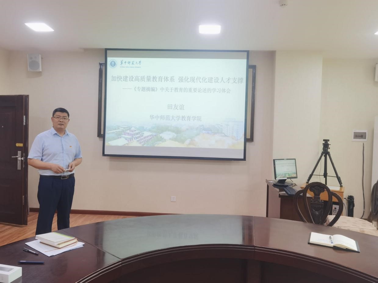6月12日上午,我院学习贯彻习近平新时代中国特色社会主义思想主题教育专题读书班暨专题党课在田家炳403会议室举行。教育学院副院长田友谊进行党员领导干部专题读书班领学,并以“加快建设高质量教育体系,强化现代化建设人才支撑”为题,向领导班子成员讲授专题党课。