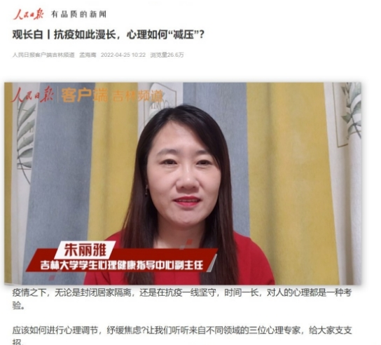 疫情期间,吉林大学思政创新中心发挥心理育人智库功能和社会心理服务职能,作为心理健康教育专家,吉林大学学生心理健康指导中心副主任朱丽雅面向受疫情影响的人民群众普及心理健康知识,提供疫情期间缓解心理压力的方式方法,并提出如下几点建议:在面对如其来变化所产生紧张、焦虑、恐惧等情绪时,需要认识到,这是在特殊时期的正常的心理反应,尝试允许和接纳这种不良情绪,可采用适当的调节方法,比如进行呼吸放松训练、正念冥想等进行情绪调节。在面对疫情所导致的学习与生活方式发生变化,建议保持科学的生活节奏,规律作息和饮食,不熬夜,不过多地沉迷于电子设备,保持合理有序的生活有利于提升生活掌控感。面对长期的负面情绪困扰,建议充分利用网络平台、联络亲朋好友,倾诉感受、相互鼓励。当出现无法主动调节的情况时,及时寻求专业人员帮助。2022年4月25日,人民日报对相关工作进行了报道,客户端浏览量26.6万次。
