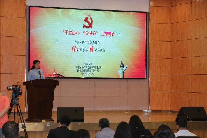 2019年6月13日下午,为深入贯彻习近平总书记在“不忘初心牢记使命”主题教育工作会议上的讲话精神,以全新的精神面貌迎接中华人民共和国成立70周年,由固体地球物理双带头人党支部书记工作室进行策划,地球探测科学与技术学院党委组织实施的主题教育活动:“读红色家书悟革命初心” 在吉林大学朝阳校区图书馆报告厅举行。