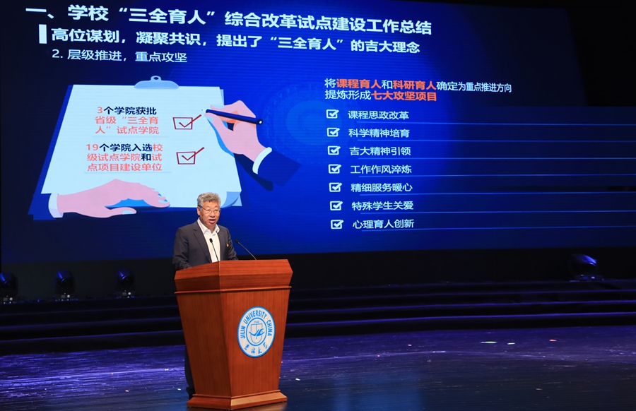 “凝心聚力,守正创新,全力构建吉大特色的思想政治工作体系。”6月18日下午,吉林大学“三全育人”试点建设总结暨“引领工程”推进会在中心校区鼎新大讲堂召开。会议旨在全面总结“三全育人”工作经验和做法,系统梳理学校思想政治工作品牌和特色,推进落实“引领工程”目标和任务,完善立德树人长效机制,全面提升人才培养水平。校党委书记姜治莹作动员讲话,校长张希主持会议。