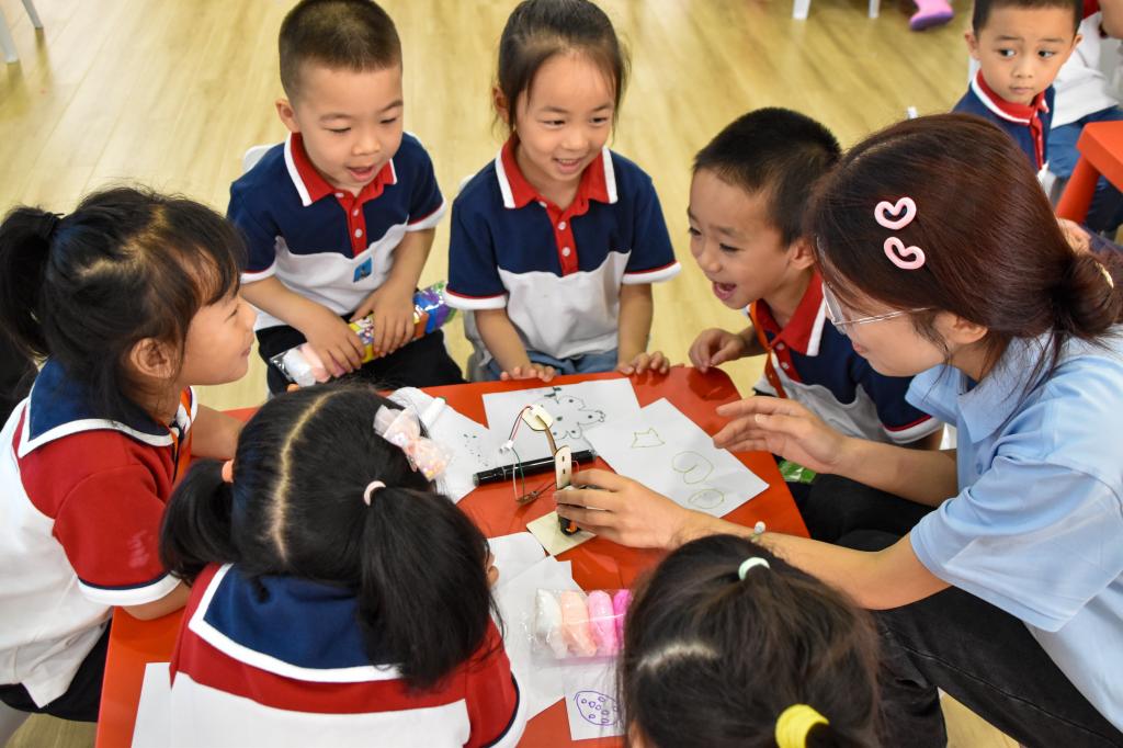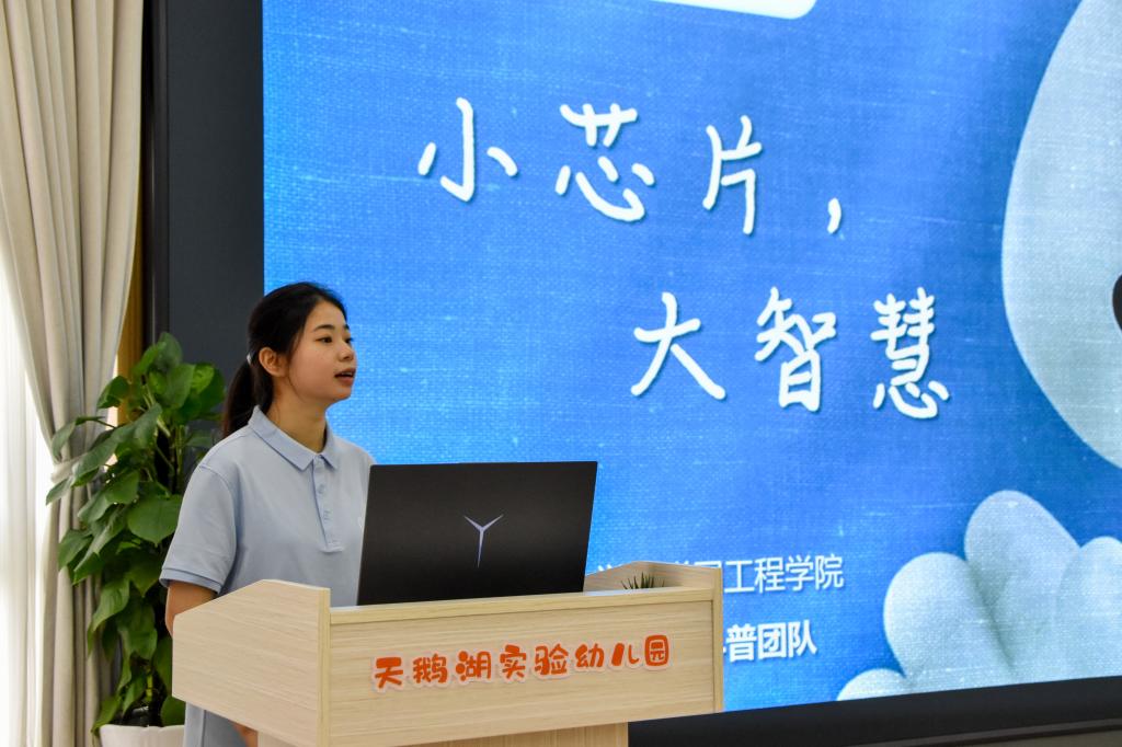 “指甲盖大小的芯片看似平淡无奇,在高倍显微镜下进行观察会发现上面布满了密密麻麻的线条,其难度相当于在比头发丝还细的地基上盖高楼大厦。”课堂上,志愿者陈青云利用丰富的动画、生动的话语、活泼的肢体动作,从多个方面向孩子们科普芯片的相关知识。“芯片在我们的日常生活中有哪些运用?”陈青云以问题为出发点,引导小朋友结合生活实践经验积极思考。“智能手表、手机、汽车、电脑……”小朋友踊跃举手,争先恐后地分享着自己的答案,课堂氛围十分活跃。