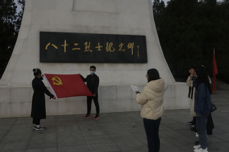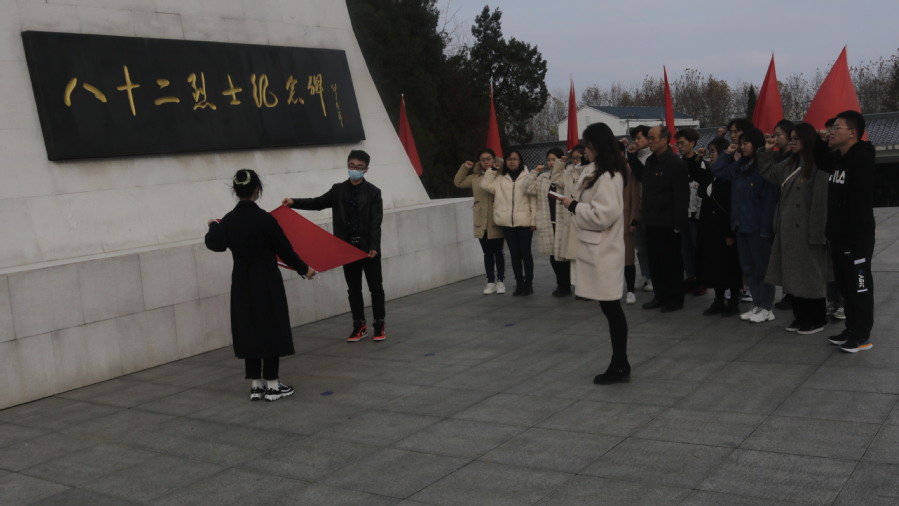 下午2:00,参加活动的全体人员第一站来到了淮阴区刘老庄八十二烈士陵园。一走进烈士纪念馆,一幅幅革命烈士捐躯为国的图片和一篇篇再现往昔历史纪实的文字,汇成一曲曲气壮山河的悲壮战歌,在每个人心中久久回荡。从烈士纪念馆出来,大家来到纪念碑前三鞠躬,向烈士们表达沉重的悼念和深切的缅怀之情。接着,讲解员给大家生动讲解了八十二烈士们的英勇事迹,烈士们不畏困难、英勇杀敌的英雄气概在大家心中留下了深刻的印象。随后,于慧婷老师带领上半年刚发展的新党员在纪念碑前集体宣誓、纪彤老师带领学生党支部全体党员重温了入党誓词。最后,马树忠对广大学生党员和入党积极分子发出了寄予,并提出了殷切的期望,希望他们能坚定信念,努力学习,未来能参与到建设美好家乡中去,报效祖国,去实现自我人生价值。