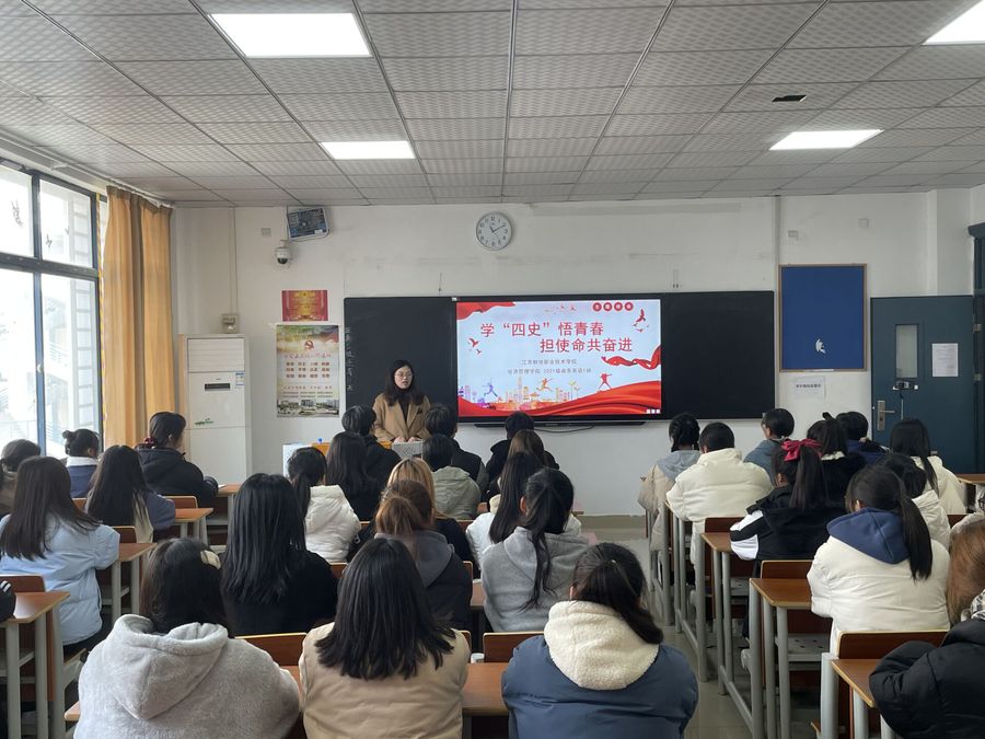 12月12日上午10点半,经管学院21级商务英语1班在文渊楼308开展了“学‘四史’悟青春,担使命共奋进”的主题班会。