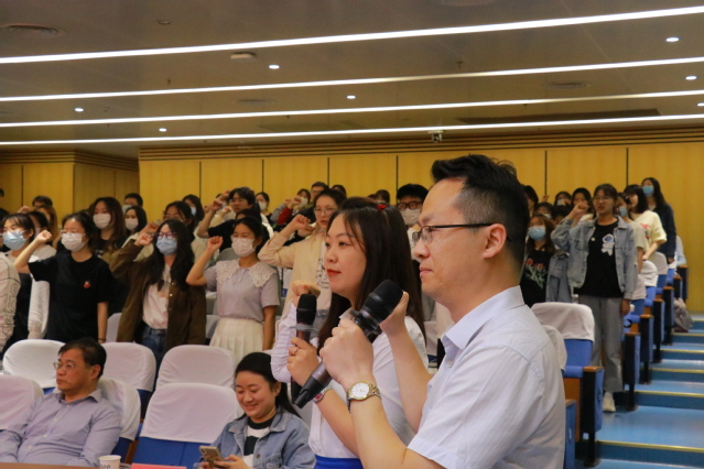 辅导员马文立和研究生班主任张进玮老师带领全体同学起立,半举右拳,在家长和在场的领导老师们的见证下齐声朗读铮铮考研誓词。