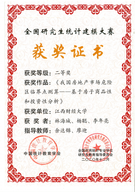 近日,我校统计学院研究生林海城、李年亮和杨聪组成的团队在余达锦教授及廖迎老师的指导下荣获2020年全国研究生统计建模大赛二等奖。