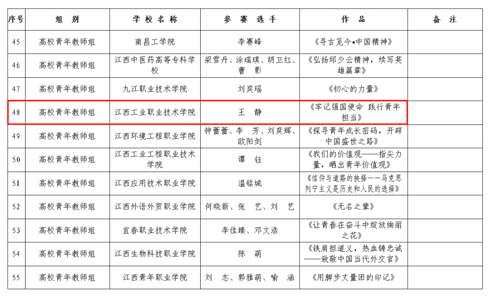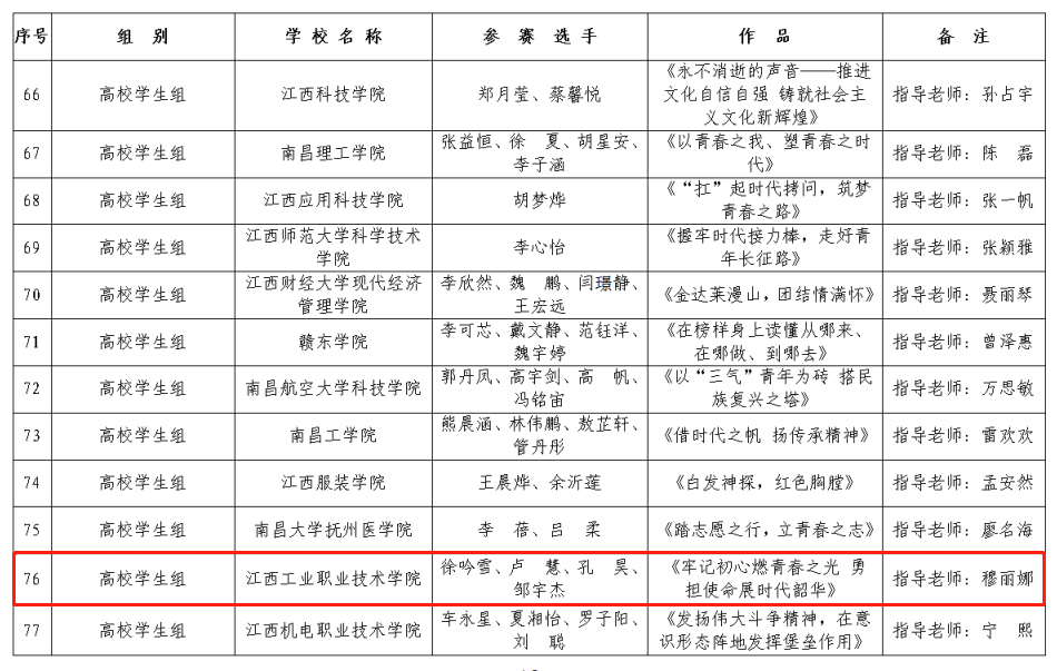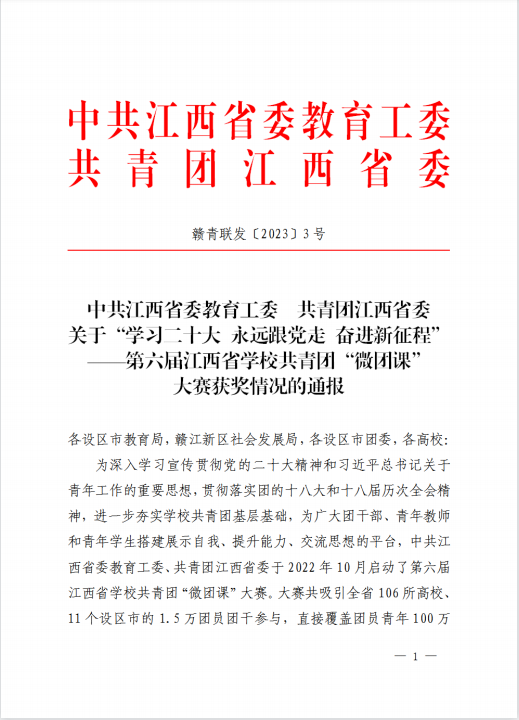 近日,由中共江西省委教育工委、共青团江西省委主办的“学习二十大 永远跟党走 奋进新征程”——第六届江西省学校共青团“微团课”大赛结果公布,我院师生在比赛中喜获佳绩。其中,支部党员王静获青年教师组三等奖;支部党员辅导员穆丽娜和徐吟雪、卢慧、孔昊、邹宇杰四位同学组成的团队获青年学生组三等奖。
