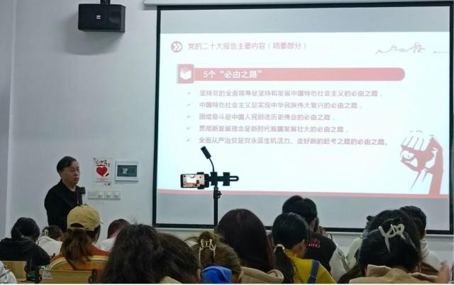 开班典礼结束后,软件动漫学院党委书记涂晓群从“党的二十大的精髓要义”、“数字解读党的二十大报告”、“不忘初心跟党走 青春建功新时代”三个方面,为学员们讲述了轮训班第一课《学习二十大 永远跟党走奋进新征程》。